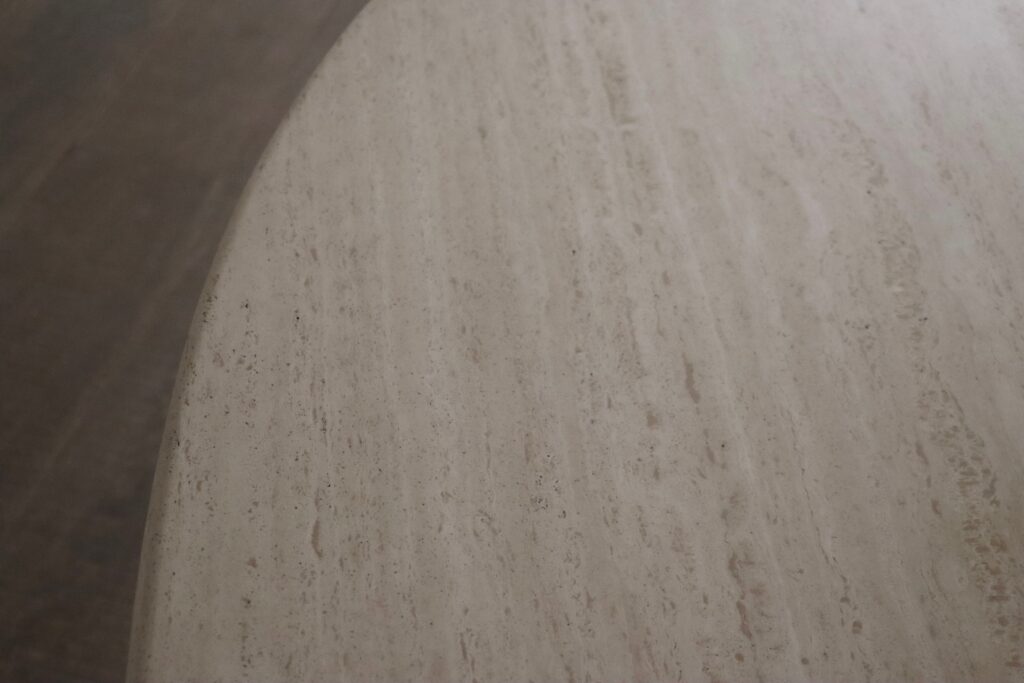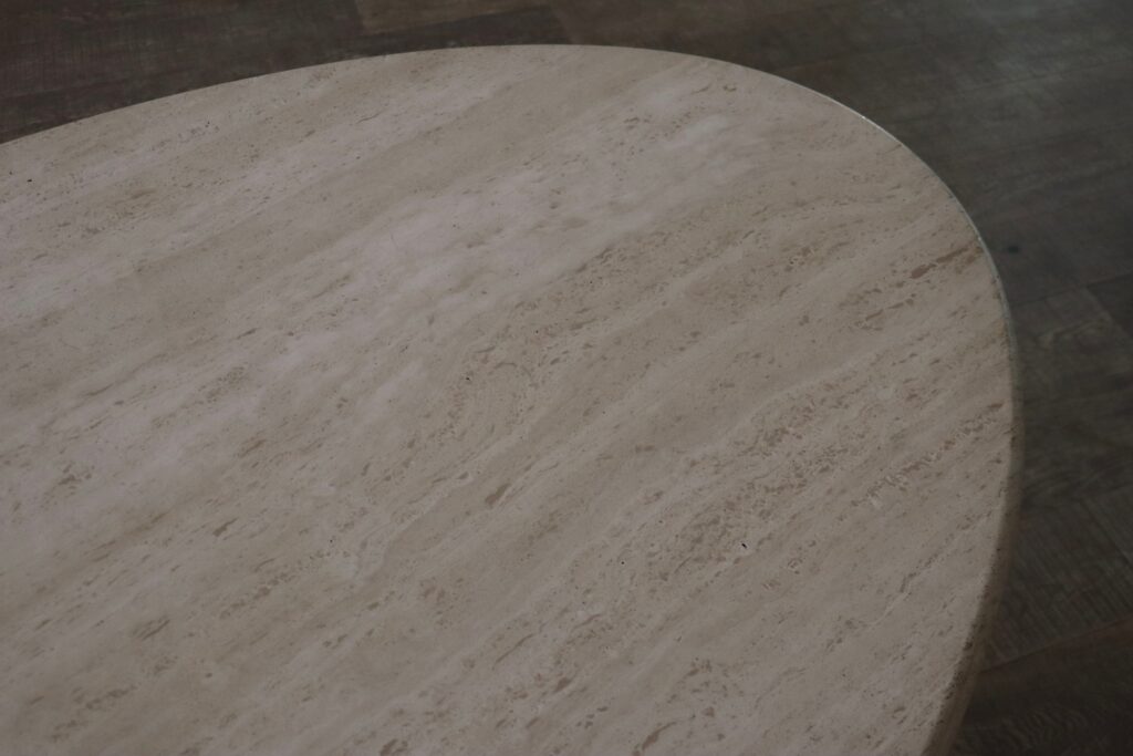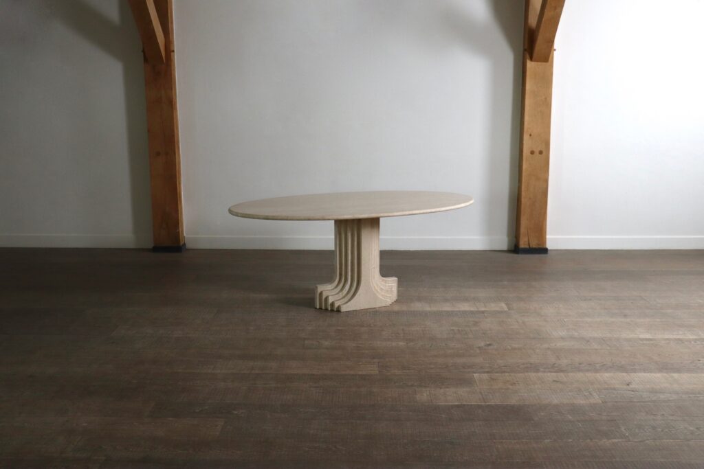 The table is based on an elegant single pedestal leg made of multiple ‘layers’ of travertine, reflecting Scarpa’s interpretation of classical architecture. The oval shaped table top comes in beautifully veined travertine. This striking statement piece will elevate any dining or meeting area!