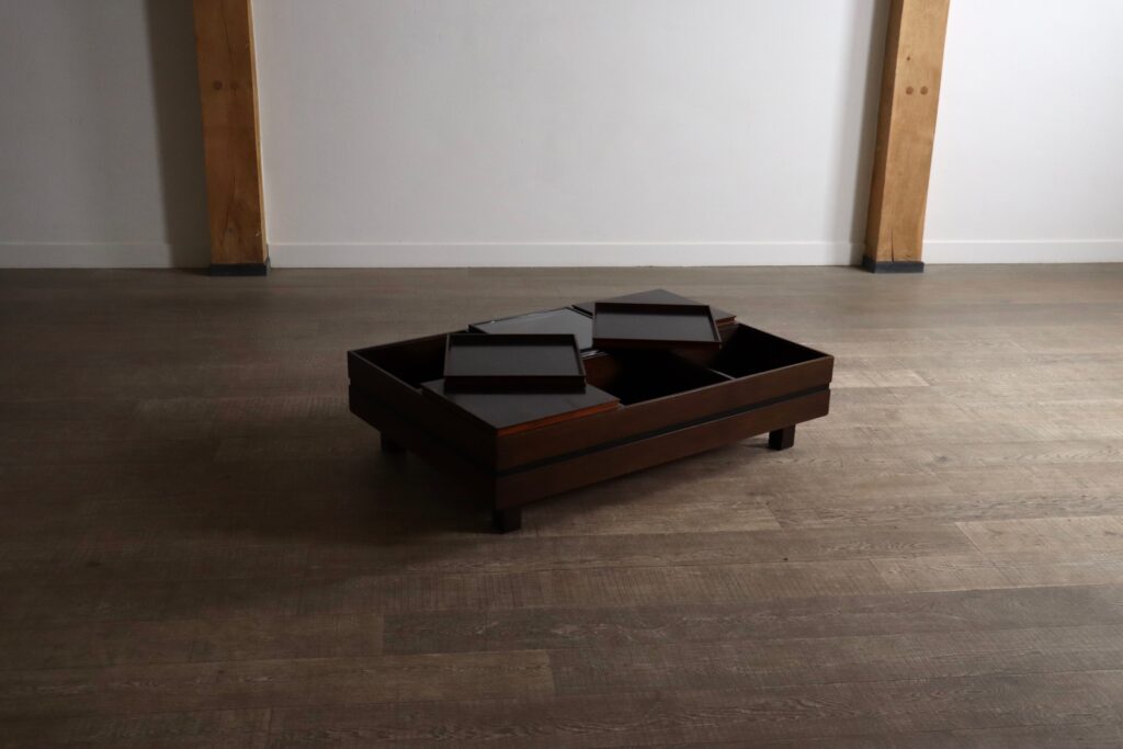 The design is highly versatile due to its modular components and trays. The coffee table has a teak wooden structure and it has several trays/tops in black laminate on one side, and teak wood on the other side which can be interchanged, and also a glass top. The tops can be positioned to your own wishes and one compartment is fully open.
