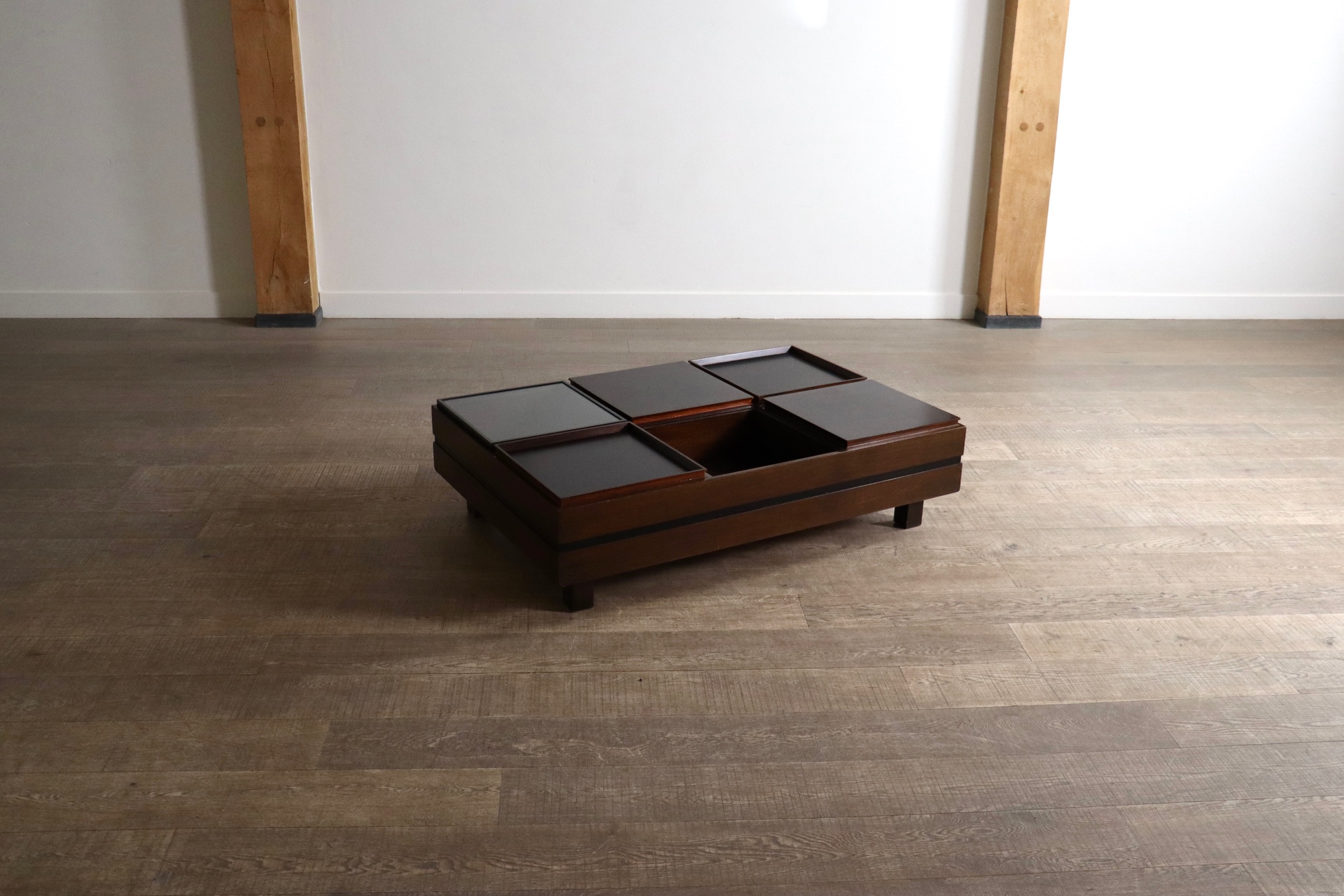 The design is highly versatile due to its modular components and trays. The coffee table has a teak wooden structure and it has several trays/tops in black laminate on one side, and teak wood on the other side which can be interchanged, and also a glass top. The tops can be positioned to your own wishes and one compartment is fully open.