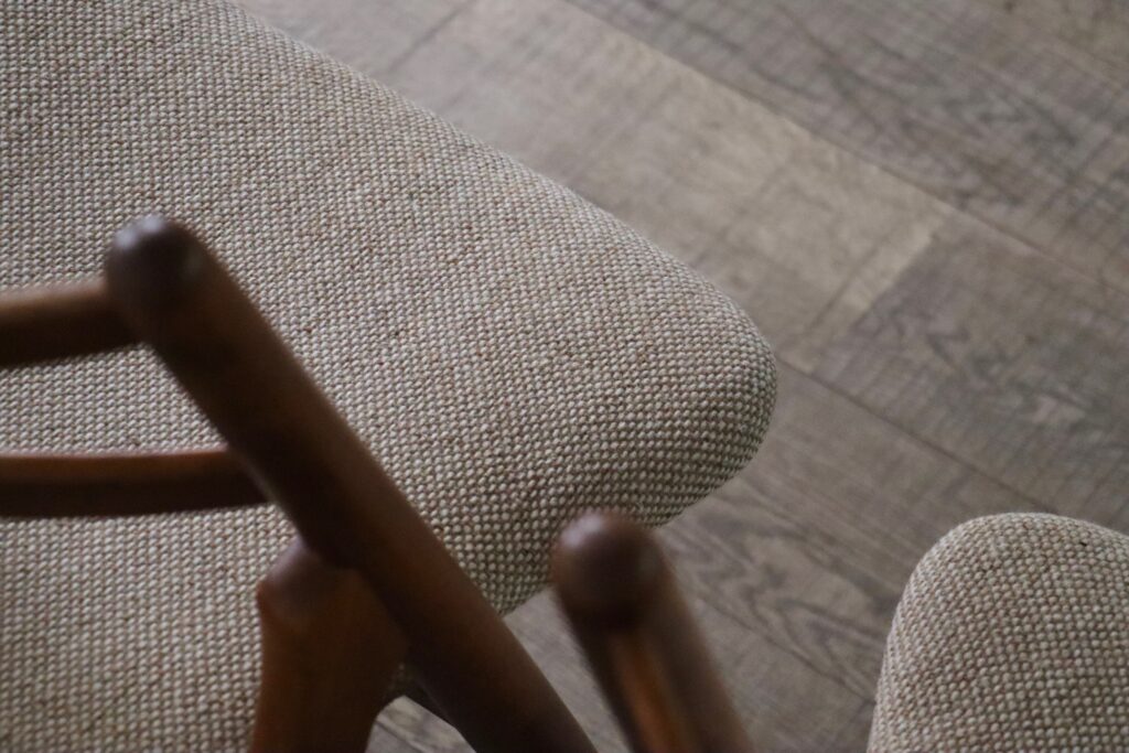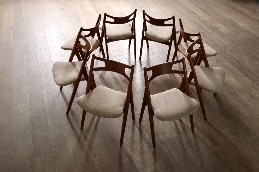 This design classic is also called “Sawbuck chair” because the model resembles a sawhorse. The sawhorse was traditionally used in the Scandinavian countries by carpenters and lumberjacks. As all Wegner designs are known for, the CH29 is expertly constructed and very comfortable. This particular set is made of solid oak and features the original beige wool upholstery. A nice set to elevate any dining or meeting area with authentic Scandinavian character.